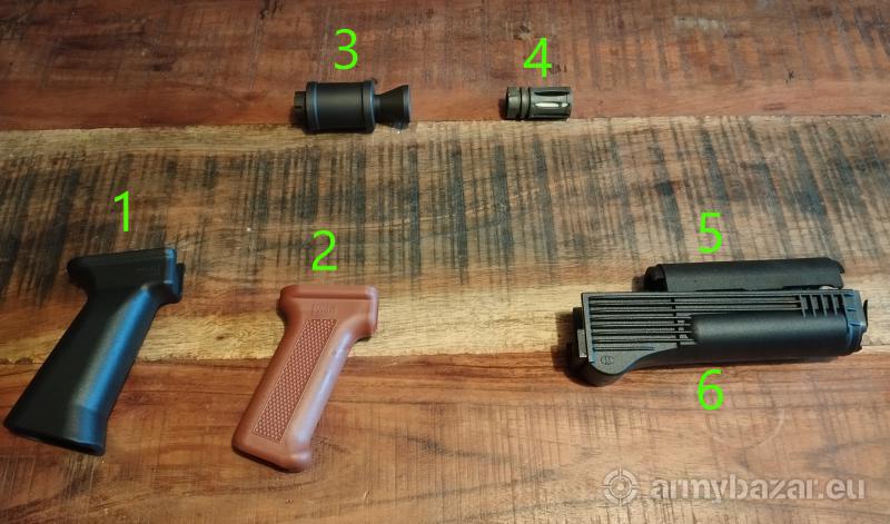 Opis: Akcesoria zdjęte z nowego karabinka WBP Jack, bądź niedługo po zakupie i przelocie nie więcej niż 100 szt. Cena to połowa sklepowej + koszt przesyłki paczkomatem. 1. Powiększona rękojeść polimerowa - z śrubą ale bez nakrętki, nowa, 50 zł 2. Standardowa brązowa rękojeść polimerowa - komplet z śrubą i nakrętką, używana, 50 zł 3. Tłumik płomienia - popularny "gwizdek", używany, 150 zł 4. Tłumik płomienia ASG (aluminiowy) typu "bird cage" z gwintem M14x1L, wyfrezowanym chałupniczo kanałkiem na kołek blokujący i pryśnięty zielonym Fosco, używany - 20 zł 5. Polimerowa nakładka rury gazowej - nowa, 35 zł 6. Łoże polimerowe - nowe, 50 zł