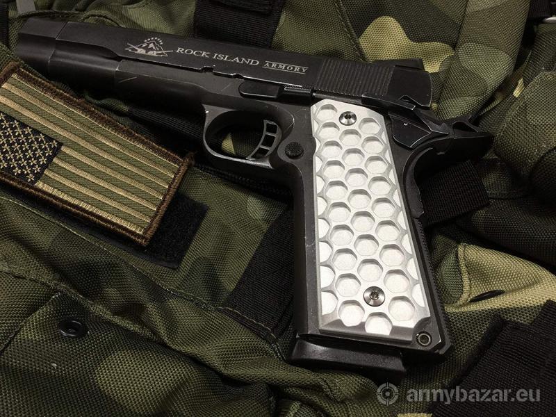 Opis: OKŁADKI CHWYTU K62-S do Colt 1911 i pokrewnych wykonane z ALUMINIUM na maszynach CNC o strukturze PLASTRA MIODU. NOWOŚĆ w kraju! Dostępne TYLKO u Nas. Okładki pasują do standardowych Coltów oraz ich klonów ze standardowymi magazynkami. W SPRZEDAŻY 2 WERSJE KOLORYSTYCZNE: CZARNE oraz SREBRNE. Stanowią IDEALNE połączenie z Naszym kompensatorem (dostępnym na Naszych innych aukcjach). DANE TECHNICZNE: Materiał: aluminium CNC Waga: 68 g Wymiary: 107 mm / 37 mm / 5 mm Pasuje do: Colt 1911 i pochodne - WSZYSTKIE kalibry: .38 / .45 / 9 mm