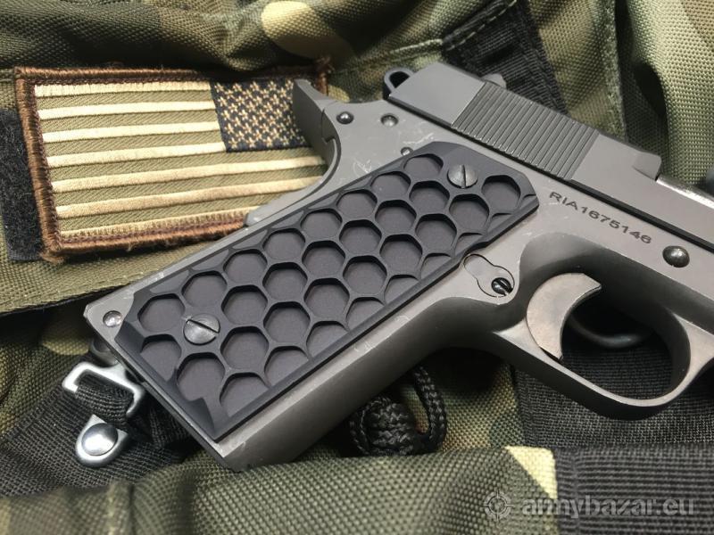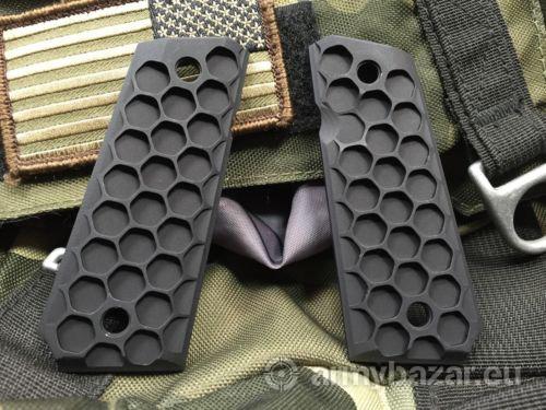 Opis: OKŁADKI CHWYTU K62 do Colt 1911 i pokrewnych wykonane z ALUMINIUM na maszynach CNC o strukturze PLASTRA MIODU. NOWOŚĆ w kraju! Dostępne TYLKO u Nas. Okładki pasują do standardowych Coltów oraz ich klonów ze standardowymi magazynkami. POSIADAMY W SPRZEDAŻY 2 WERSJE KOLORYSTYCZNE: CZARNE oraz SREBRNE. Stanowią IDEALNE połączenie z Naszym kompensatorem (dostępnym na Naszych innych aukcjach). DANE TECHNICZNE: Materiał: aluminium CNC Waga: 68 g Wymiary: 107 mm / 37 mm / 5 mm Pasuje do: Colt 1911 i pochodne - WSZYSTKIE kalibry: .38 / .45 / 9 mm Wystawiamy faktury VAT !