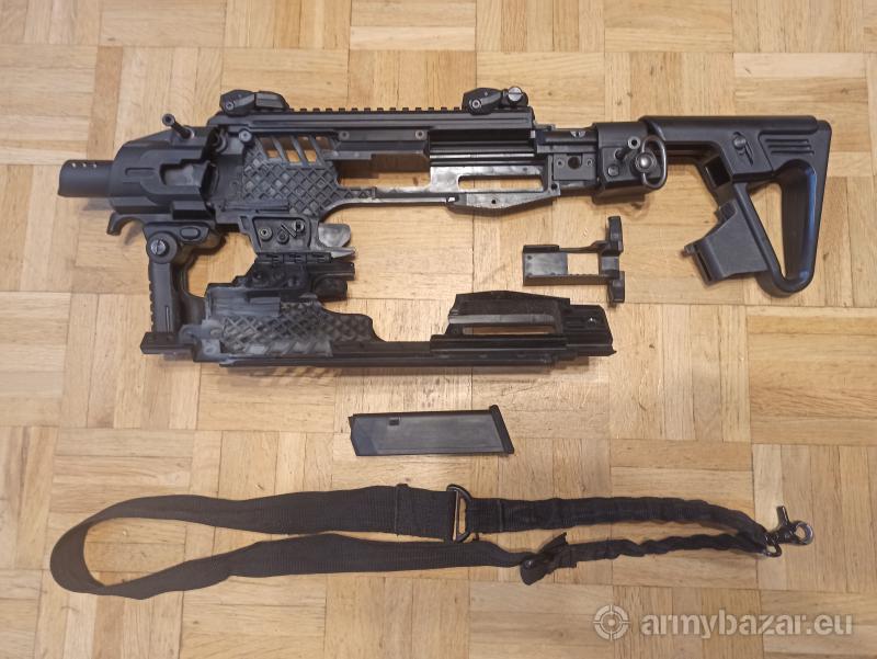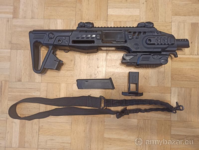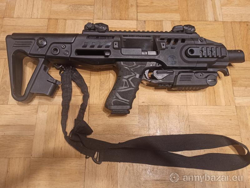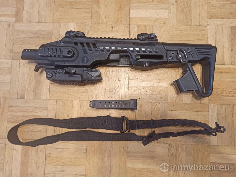 Opis: Konwersja firmy CAA Roni gen. 2 do broni palnej Glock model 17/19, zestaw używany, 100% sprawny, bez uszkodzeń i wad ukrytych, skład konwersji jak na zdjęciach: przyrządy celownicze składane Fab Defense, mocowanie jednopunktowe CAA, pas jednopunktowy CAA, magazynek 17 nab. Glock. Montaż broni w zestawie to zaledwie kilkanaście sekund. Zestaw sprzedawany bez broni, nie wymaga pozwolenia. Dł. rozłożonego zestawu 59cm, ze złożoną kolbą 50cm; wys. z rozłożonymi przyrządami celowniczymi i chwytem przednim 23 cm, wys. z rozłożonymi przyrządami celow. i złożonym chwytem przednim 19cm; szer. 7cm. Przy Glocku 19 długość krótsza o ok 1,5cm.