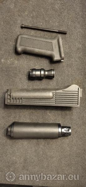 Opis: Sprzedaję zestaw oryginalnych części do karabinka Hellpup kal. 7,62x39 mm: - rura gazowa wraz z górną nakładką, - dolne łoże/nakładka, - gwizdek na lufę (gwint 14/1 L), - rękojeść wraz ze śrubą, - kolba składana.