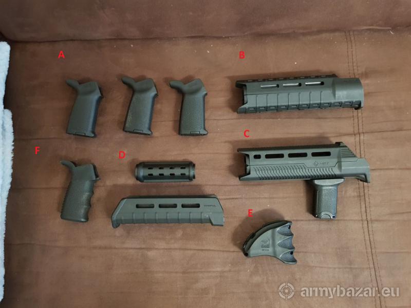 Opis: A - chwyty MOE Magpul - 80 PLN sztuka + wysylka, nowe, zdjete z karabinkow. B - handguard do AR15 Magpul, 150 PLN + wysylka, uzywany, stan dobry C - handguard do AR15 firmy MFT, 100 PLN + wysylka, bardzo lekki ! D - handguard do AK47, Magpul, 150 PLN + wysylka - wersja dla karabinkow bez oczka do zawieszenia !, uzywany stan dobry E - chwyt ma magazynek do AR15, FAB - 80 PLN + wysylka F - chwyt pistoletowy do AR15 MFT, 100 PLN + wysylka Ceny do rozsadnej negocjacji, uzbieralo sie tego z czasem i zajmuje miejsce, chce sprzedac. Ew. odbior osobisty Katowice.