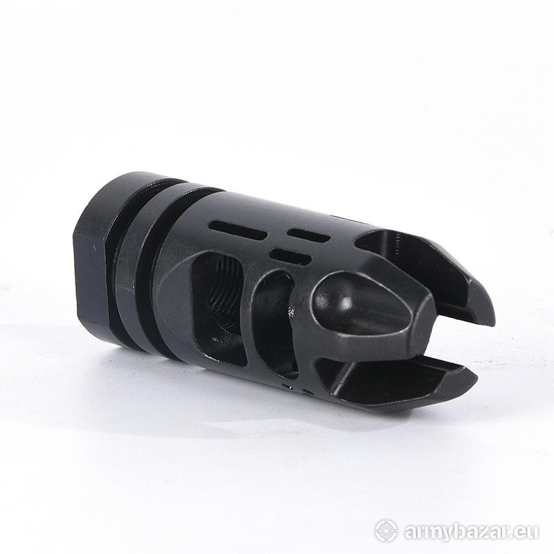 Opis: KOMPENSATOR K70 do AR-15 / M4 / M16 : kompaktowe wymiary połączenie kompensatora odrzutu, hamulca wylotowego oraz tłumika płomienia dwie komory skutecznie redukujące odrzut broni 6 podłużnych otworów stabilizujących lufę i obniżających uczucie podrzutu broni zęby na froncie redukujące ogień wylotowy wysoka skuteczność działania azotowana na czarno powłoka, wytrzymalsza i odporniejsza na wypalenie od oksydy DANE TECHNICZNE: Materiał: stal 4140 Powłoka: azotowana QPQ Waga: 67 g Wymiary: 56 mm / 22 mm Gwint: 1/2 x 28 Kaliber: .22 / .223