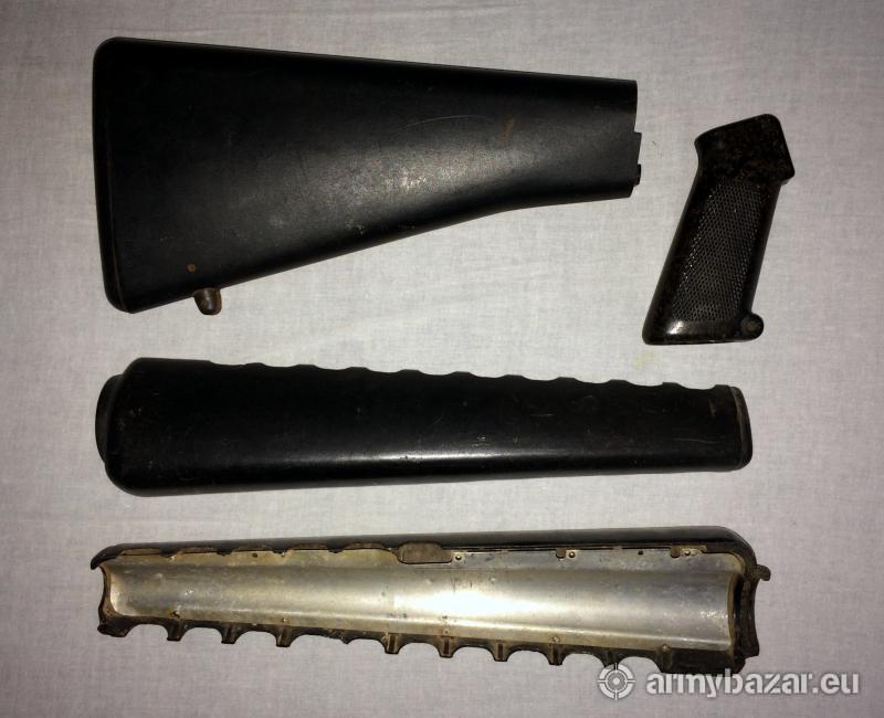 Opis: Na sprzedaż oryginalne części: kolba, chwyt pistoletowy i przednie okładziny do M16 / AR15 z okresu wojny w Wietnamie. Stan bardzo dobry.