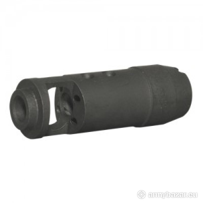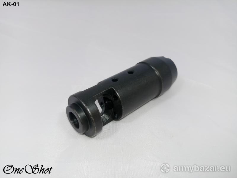 Opis: KOMPENSATOR AK-01: dwie komory skutecznie redukujące odrzut broni dwa otwory stabilizujące lufę i zmniejszające efekt podrzutu broni cztery frontalne otwory odprowadzające płomień wylotowy wytrzymała i odporna powłoka oksydowana wykonany na maszynach CNC wysoka skuteczność działania DANE TECHNICZNE: Materiał: stal Powłoka: oksydowana Waga: 130 g Wymiary: 80 mm / 25 mm Gwint: 14 x 1 L Kaliber: 7.62x39