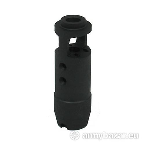 Opis: KOMPENSATOR AK-01: dwie komory skutecznie redukujące odrzut broni dwa otwory stabilizujące lufę i zmniejszające efekt podrzutu broni cztery frontalne otwory odprowadzające płomień wylotowy wytrzymała i odporna powłoka oksydowana wykonany na maszynach CNC wysoka skuteczność działania DANE TECHNICZNE: Materiał: stal Powłoka: fosfatowana Waga: 130 g Wymiary: 80 mm / 25 mm Gwint: 14 x 1 L Kaliber: 7.62x39
