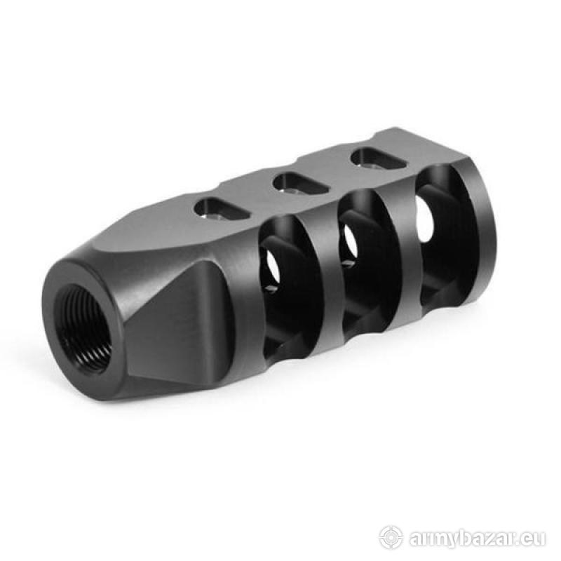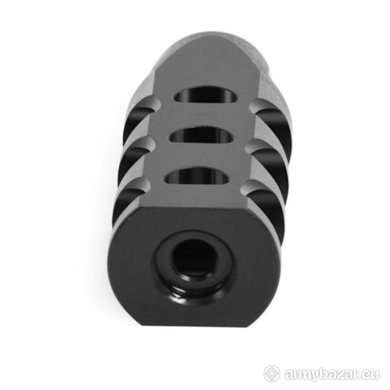 Opis: KOMPENSATOR C3-AK : trzy komory skutecznie redukujące odrzut broni trzy powiększone otwory dla lepszego odprowadzania gazów, stabilizujące lufę i zmniejszające efekt podrzutu broni azotowana na czarno powłoka, wytrzymalsza i odporniejsza na wypalenie od oksydy wysoka skuteczność działania wykonany na maszynach CNC DANE TECHNICZNE: Materiał: stal 4140 Powłoka: azotowana QPQ Waga: 224 g Wymiary: 78 mm / 35 mm / 28 mm Gwint: 14x1 L Kaliber: 7.62 x 39. W ZESTAWIE nakrętka i podkładka.