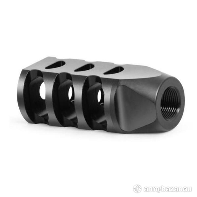Opis: KOMPENSATOR C3-AK : trzy komory skutecznie redukujące odrzut broni trzy powiększone otwory dla lepszego odprowadzania gazów, stabilizujące lufę i zmniejszające efekt podrzutu broni azotowana na czarno powłoka, wytrzymalsza i odporniejsza na wypalenie od oksydy wysoka skuteczność działania wykonany na maszynach CNC DANE TECHNICZNE: Materiał: stal 4140 Powłoka: azotowana QPQ Waga: 224 g Wymiary: 78 mm / 35 mm / 28 mm Gwint: 14x1 L Kaliber: 7.62 x 39. W ZESTAWIE nakrętka i podkładka.
