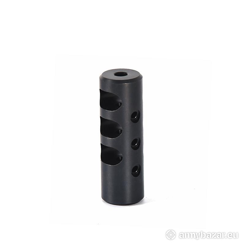 Opis: KOMPENSATOR K01 do AR-15 / M4 / M16: dwie komory skutecznie redukujące odrzut broni pięć otworów stabilizujących lufę i zmniejszających uczucie podrzutu broni azotowana na czarno powłoka, wytrzymalsza i odporniejsza na wypalenie od oksydy wysoka skuteczność działania DANE TECHNICZNE: Materiał: stal 4140 Powłoka: azotowana QPQ Waga: 123 g Wymiary: 70 mm / 23 mm Gwint: 1/2 x 28 Kaliber: .22 / .223