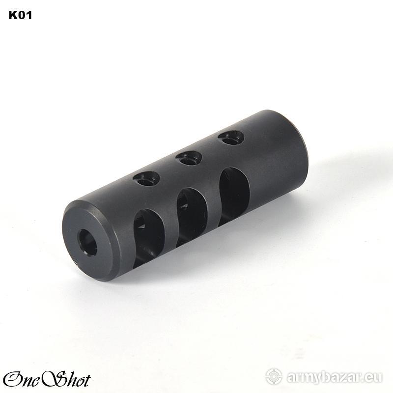 Opis: KOMPENSATOR K01 do AR-15 / M4 / M16: dwie komory skutecznie redukujące odrzut broni pięć otworów stabilizujących lufę i zmniejszających uczucie podrzutu broni azotowana na czarno powłoka, wytrzymalsza i odporniejsza na wypalenie od oksydy wysoka skuteczność działania DANE TECHNICZNE: Materiał: stal 4140 Powłoka: azotowana QPQ Waga: 123 g Wymiary: 70 mm / 23 mm Gwint: 1/2 x 28 Kaliber: .22 / .223