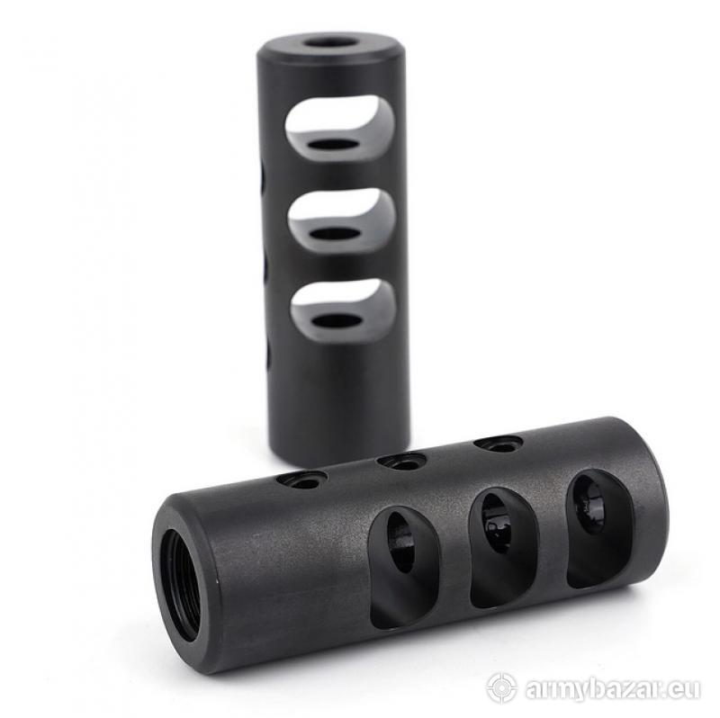 Opis: KOMPENSATOR K03-18 do karabinu SAKO oraz innych z gwintem 18x1: trzy komory skutecznie redukujące odrzut broni, stabilizujące lufę i zmniejszające efekt podrzutu broni trzy otwory wylotowe dla lepszej stabilizacji lufy oraz zmniejszenia efektu podrzutu broni azotowana na czarno powłoka, wytrzymalsza i odporniejsza na wypalenie od oksydy wysoka skuteczność działania wykonany na maszynach CNC DANE TECHNICZNE: Materiał: stal 4140 Powłoka: azotowana QPQ Waga: 113 g Wymiary: 70 mm / 23 mm Gwint: 18 x 1 Kaliber: .308 / 7.62