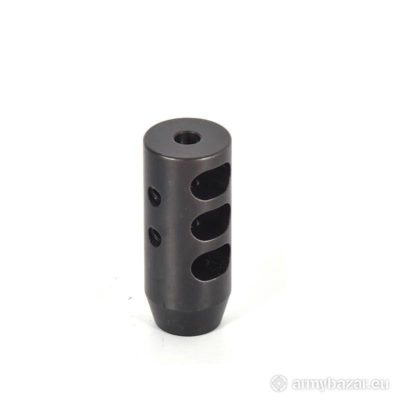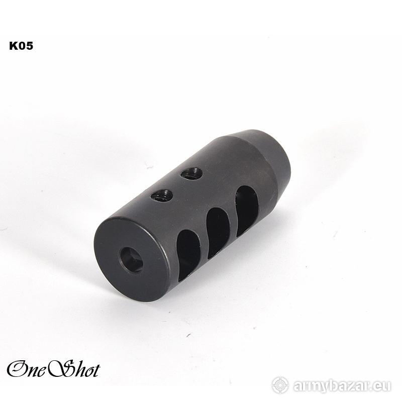 Opis: KOMPENSATOR K06 do 7.62/.308 na gwint 5/8x24: trzy komory skutecznie redukujące odrzut broni, dwa otwory stabilizujące lufę i obniżające uczucie podrzutu broni, azotowana na czarno powłoka, wytrzymalsza i odporniejsza na wypalenie od oksydy, wysoka skuteczność działania. DANE TECHNICZNE: Materiał: stal 4140 Powłoka: azotowana QPQ Waga: 104 g Wymiary: 60 mm / 25 mm Gwint: 5/8 x 24 Kaliber: .308 / 7.62x51