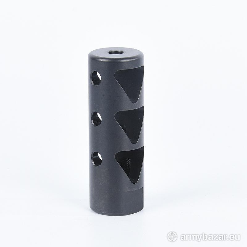 Opis: KOMPENSATOR K09 do AR-15 / M4 / M16 : trzy komory skutecznie redukujące odrzut broni trzy skośne otwory stabilizujące lufę i zmniejszające uczucie podrzutu broni azotowana na czarno powłoka, wytrzymalsza i odporniejsza na wypalenie od oksydy wysoka skuteczność działania DANE TECHNICZNE: Materiał: stal 4140 Powłoka: azotowana QPQ Waga: 142 g Wymiary: 73 mm / 25 mm Gwint: 1/2x28 Kaliber: .223