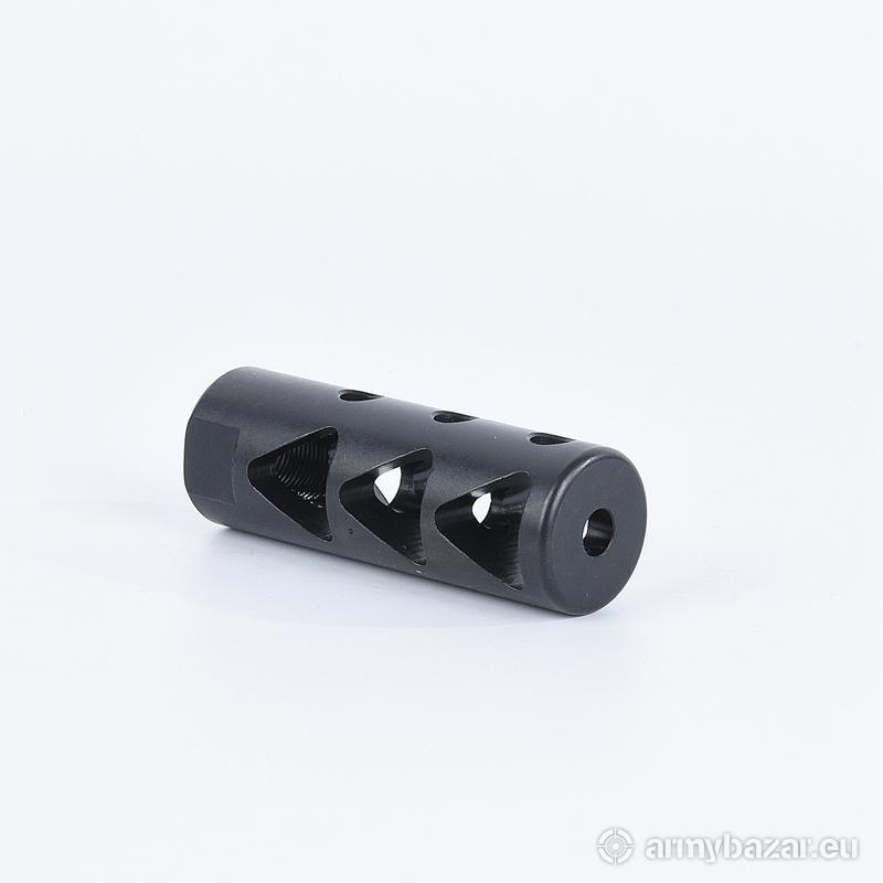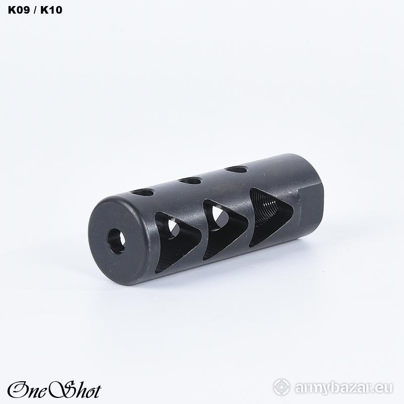 Opis: KOMPENSATOR K10 : trzy komory skutecznie redukujące odrzut broni trzy skośne otwory stabilizujące lufę i zmniejszające uczucie podrzutu broni azotowana na czarno powłoka, wytrzymalsza i odporniejsza na wypalenie od oksydy wysoka skuteczność działania DANE TECHNICZNE: Materiał: stal 4140 Powłoka: azotowana QPQ Waga: 142 g Wymiary: 73 mm / 25 mm Gwint: 5/8 x 24 Kaliber: .308 / 7.62x51 NATO