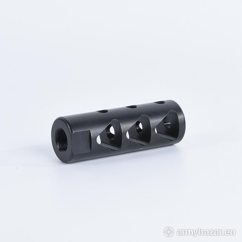 Opis: KOMPENSATOR K10 : trzy komory skutecznie redukujące odrzut broni trzy skośne otwory stabilizujące lufę i zmniejszające uczucie podrzutu broni azotowana na czarno powłoka, wytrzymalsza i odporniejsza na wypalenie od oksydy wysoka skuteczność działania DANE TECHNICZNE: Materiał: stal 4140 Powłoka: azotowana QPQ Waga: 142 g Wymiary: 73 mm / 25 mm Gwint: 5/8 x 24 Kaliber: .308 / 7.62x51 NATO