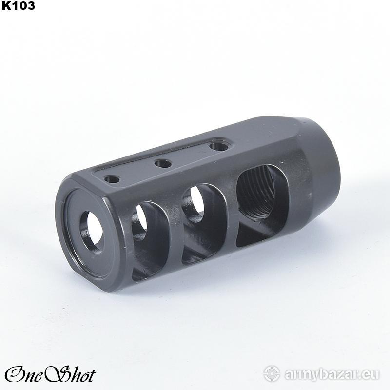 Opis: KOMPENSATOR K104 do 7.62 / .308 - 5/8x24: trzy komory skutecznie redukujące odrzut broni, trzy powiększone otwory stabilizujące lufę i obniżające uczucie podrzutu broni, azotowana na czarno powłoka, wytrzymalsza i odporniejsza na wypalenie od oksydy, wysoka skuteczność działania. DANE TECHNICZNE: Materiał: stal 4140 Powłoka: azotowana QPQ Waga: 81 g Wymiary: 60 mm / 25 mm Gwint: 5/8x24 Kaliber:7.62 / .308