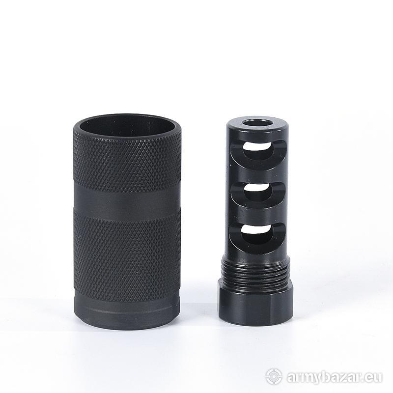 Opis: KOMPENSATOR K11 do AR-15 / M4 / M16: urządzenie wylotowe podwójnego zastosowania : kompensator odrzutu oraz tłumik płomienia redukuje nieprzyjemny dla strzelca dźwięk wystrzału kierując go ku wylotowi lufy, dwuczęściowa konstrukcja: stal oraz aluminiowa osłona, trzy komory skutecznie redukujące odrzut broni, wysoka skuteczność działania, azotowana na czarno powłoka, wytrzymalsza i odporniejsza na wypalenie od oksydy, Materiał: stal 4140 / aluminium fosforanowane Powłoka: azotowana QPQ Waga: 68 g / 106 g Wymiary: 65 mm / 32 mm Gwint: 1/2 x 28 Kaliber: .22 / .223 W ZESTAWIE nakrętka i podkładka.