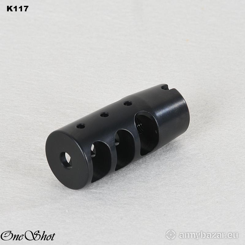 Opis: Kompensator K117 do karabinu AK AKM AKMS: trzy komory skutecznie redukujące odrzut broni trzy otwory stabilizujące lufę i zmniejszające efekt podrzutu broni wytrzymała i odporna powłoka OKSYDOWANA wykonany z WYSOKIEJ jakości stali na maszynach CNC wysoka skuteczność działania DANE TECHNICZNE: Materiał: stal Powłoka: oksydowana Waga: 106 g Wymiary: 58 mm / 25 mm Gwint: 14 x 1 LEWY Kaliber: 7.62x39