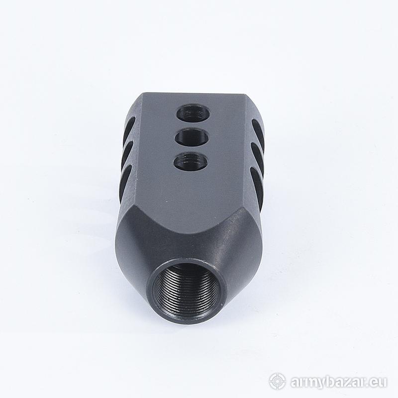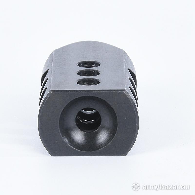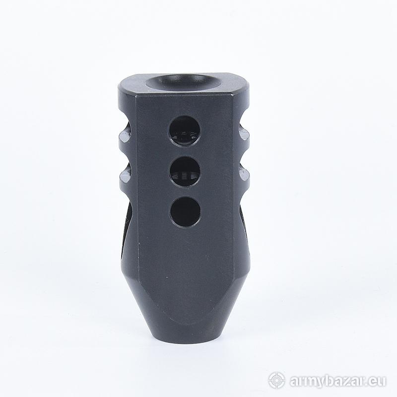 Opis: KOMPENSATOR K13 do AR-15 / M4 / M16: trzy komory skutecznie redukujące odrzut broni dwa powiększone otwory dla lepszego odprowadzania gazów, stabilizujące lufę i zmniejszające uczucie podrzutu broni azotowana na czarno powłoka, wytrzymalsza i odporniejsza na wypalenie od oksydy wysoka skuteczność działania DANE TECHNICZNE: Materiał: stal 4140 Powłoka: oksyda QPQ Waga: 205 g Wymiary: 70 mm / 35 mm / 25 mm Gwint: 1/2 x 28 Kaliber: .22 / .223