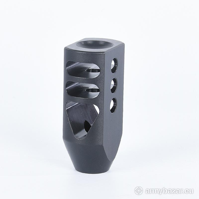 Opis: KOMPENSATOR K13 do AR-15 / M4 / M16: trzy komory skutecznie redukujące odrzut broni dwa powiększone otwory dla lepszego odprowadzania gazów, stabilizujące lufę i zmniejszające uczucie podrzutu broni azotowana na czarno powłoka, wytrzymalsza i odporniejsza na wypalenie od oksydy wysoka skuteczność działania DANE TECHNICZNE: Materiał: stal 4140 Powłoka: oksyda QPQ Waga: 205 g Wymiary: 70 mm / 35 mm / 25 mm Gwint: 1/2 x 28 Kaliber: .22 / .223