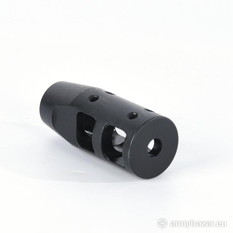 Opis: KOMPENSATOR K06 do AR-15 / M4 / M16 na gwint 1/2x28: dwie komory skutecznie redukujące odrzut broni, cztery otwory stabilizujące lufę i obniżające uczucie podrzutu broni, azotowana na czarno powłoka, wytrzymalsza i odporniejsza na wypalenie od oksydy, wysoka skuteczność działania. DANE TECHNICZNE: Materiał: stal 4140 Powłoka: azotowana QPQ Waga: 110 g Wymiary: 58 mm / 25 mm Gwint: 1/2x28 Kaliber: .223