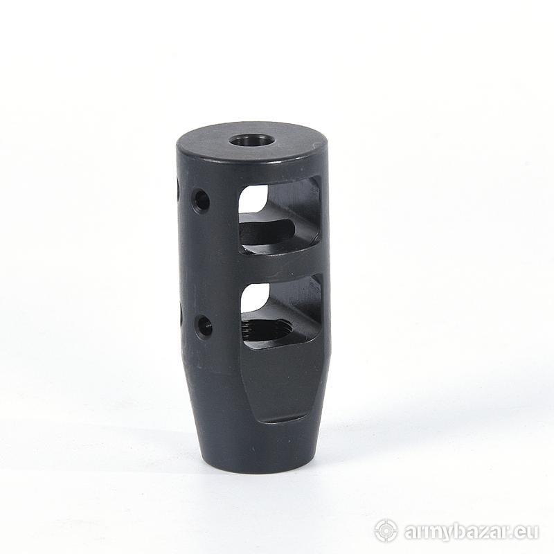 Opis: KOMPENSATOR K06 do AR-15 / M4 / M16 na gwint 1/2x28: dwie komory skutecznie redukujące odrzut broni, cztery otwory stabilizujące lufę i obniżające uczucie podrzutu broni, azotowana na czarno powłoka, wytrzymalsza i odporniejsza na wypalenie od oksydy, wysoka skuteczność działania. DANE TECHNICZNE: Materiał: stal 4140 Powłoka: azotowana QPQ Waga: 110 g Wymiary: 58 mm / 25 mm Gwint: 1/2x28 Kaliber: .223
