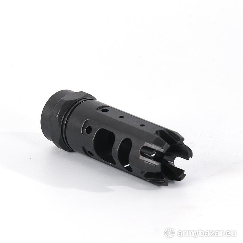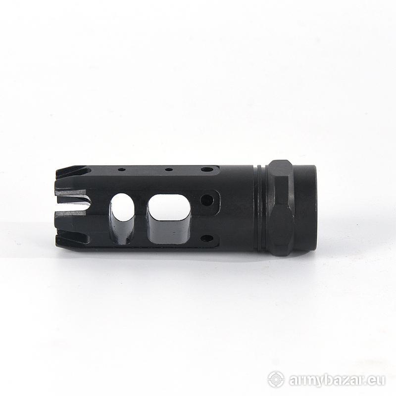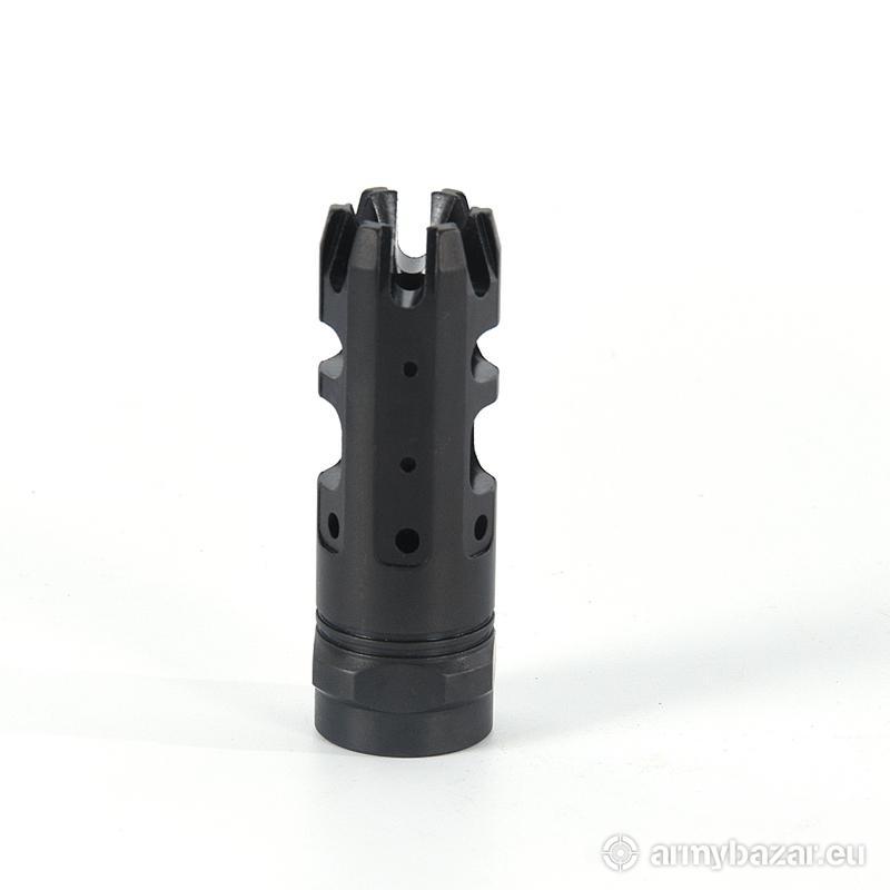Opis: KOMPENSATOR K50 do AR-15 / M4 / M16: połączenie kompensatora odrzutu oraz hamulca wylotowego dwie komory skutecznie redukujące odrzut broni cztery otwory po bokach stabilizujące lufę trzy otwory na górze zmniejszające efekt podrzutu broni zęby na froncie redukujące ogień wylotowy azotowana na czarno powłoka, wytrzymalsza i odporniejsza na wypalenie od oksydy wysoka skuteczność działania DANE TECHNICZNE: Materiał: stal 4140 Powłoka: azotowana QPQ Waga: 108 g Wymiary: 67 mm / 23 mm Gwint: 1/2 x 28 Kaliber: .22 / .223 WYSTAWIAMY FAKTURY VAT / PARAGON !