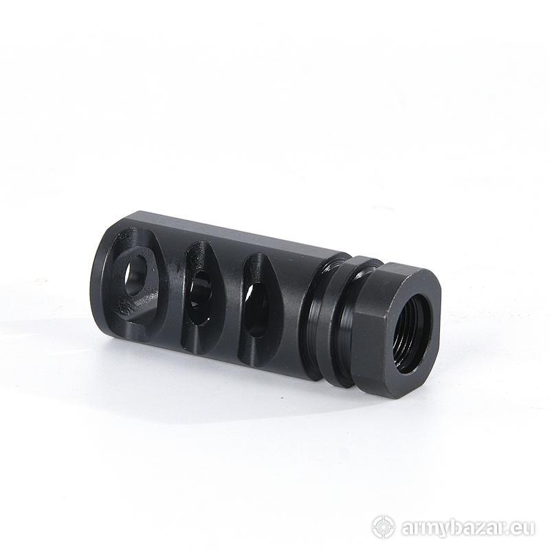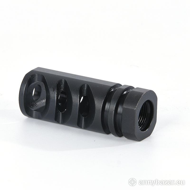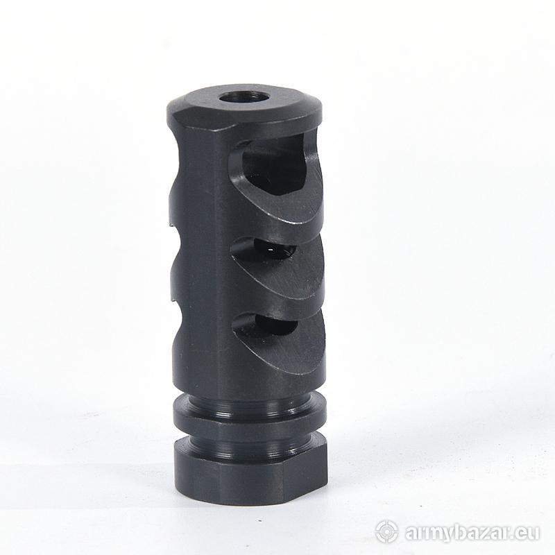 Opis: KOMPENSATOR K67 do karabinów AK / AKM / AKMS: trzy kierunkowe komory skutecznie redukujące odrzut broni, stabilizujące lufę i zmniejszające efekt podrzutu broni, azotowana na czarno powłoka, wytrzymalsza i odporniejsza na wypalenie od oksydy, wysoka skuteczność działania, wykonany na maszynach CNC, DANE TECHNICZNE: Materiał: stal 4140 Powłoka: azotowana QPQ Waga: 95 g Wymiary: 57 mm / 25 mm Gwint: 18x1 PRAWY Kaliber: 7,62x39. W ZESTAWIE nakrętka i podkładka.