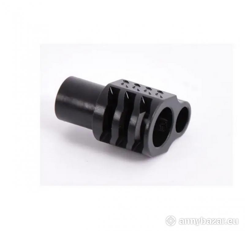 Opis: Kompensator K74 PUNISHER do Colt 1911 i pochodnych: pasuje do Coltów z lufami długości 5” ( i pochodnych ), przystosowany do kalibrów .45 ACP, .38 oraz 9 mm, trzy otwory stabilizujące broń podczas strzału i zmniejszające efekt podrzutu broni, wytrzymała i odporna OKSYDOWANA powłoka, wykonany z WYSOKIEJ jakości stali na maszynach CNC, wysoka skuteczność działania, kompensator przeznaczony jest do BRONI PALNEJ. DANE TECHNICZNE: Materiał: stal Powłoka: oksydowana Waga: 68 g Wymiary: 25 mm / 23 mm Pasuje do: Colt 1911 oraz pochodne Kaliber: .45 ACP, .38, 9 mm