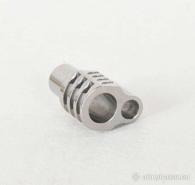 Opis: Kompensator K74 PUNISHER do Colt 1911 i pochodnych: pasuje do Coltów z lufami długości 5” ( i pochodnych ), przystosowany do kalibrów .45 ACP, .38 oraz 9 mm, trzy otwory stabilizujące broń podczas strzału i zmniejszające efekt podrzutu broni, wykonany z WYSOKIEJ jakości stali NIERDZEWNEJ na maszynach CNC, wysoka skuteczność działania, kompensator przeznaczony jest do BRONI PALNEJ. DANE TECHNICZNE: Materiał: stal Powłoka: oksydowana Waga: 68 g Wymiary: 25 mm / 23 mm Pasuje do: Colt 1911 oraz pochodne Kaliber: .45 ACP, .38, 9 mm.
