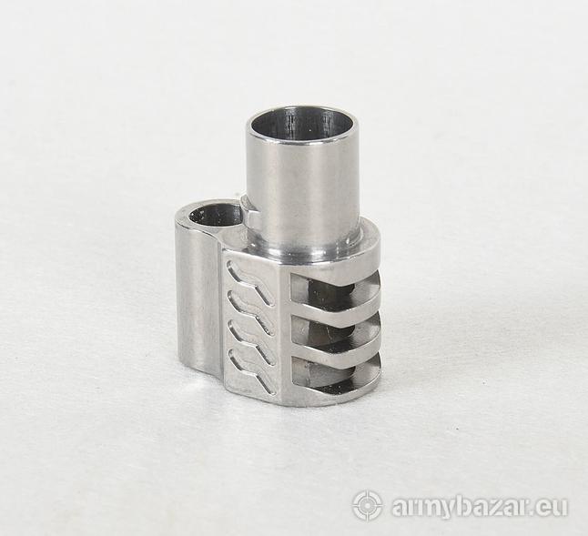 Opis: Kompensator K74 PUNISHER do Colt 1911 i pochodnych: pasuje do Coltów z lufami długości 5” ( i pochodnych ), przystosowany do kalibrów .45 ACP, .38 oraz 9 mm, trzy otwory stabilizujące broń podczas strzału i zmniejszające efekt podrzutu broni, wykonany z WYSOKIEJ jakości stali NIERDZEWNEJ na maszynach CNC, wysoka skuteczność działania, kompensator przeznaczony jest do BRONI PALNEJ. DANE TECHNICZNE: Materiał: stal Powłoka: oksydowana Waga: 68 g Wymiary: 25 mm / 23 mm Pasuje do: Colt 1911 oraz pochodne Kaliber: .45 ACP, .38, 9 mm.