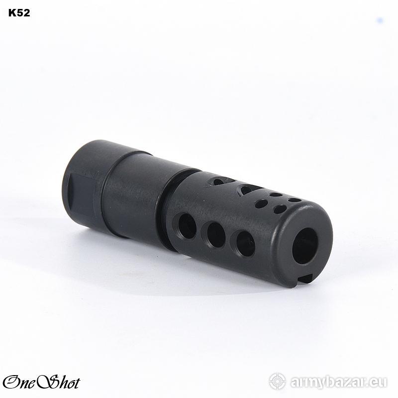 Opis: KOMPENSATOR K52: osiem otworów na górze (w tym dwa skośne) zmniejszające uczucie podrzutu broni sześć powiększonych otworów po bokach stabilizujących broń przy strzelaniu zarówno ogniem pojedynczym jak i automatycznym azotowana na czarno powłoka, wytrzymalsza i odporniejsza na wypalenie od oksydy wysoka skuteczność działania DANE TECHNICZNE: Materiał: stal 4140 Powłoka: azotowana QPQ Waga: 116 g Wymiary: 76 mm / 22 mm Gwint: 5/8 x 24 Kaliber: .308 / 7.62x51 NATO