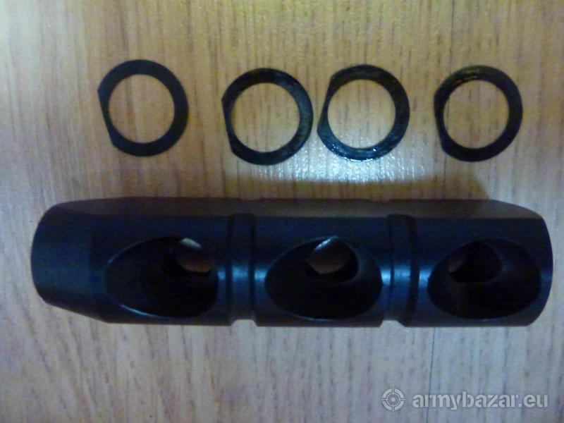 Opis: Kompensator odrzutu TWS kal.7.62 do karabinków AK. Montaż go, umożliwia zmniejszenie siły odrzutu powstającej podczas wystrzału do 50 %. Stan: b.dobry. W komplecie 4 podkładki.
