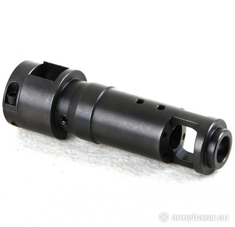 Opis: KOMPENSATOR SKS-001 : dwie komory skutecznie redukujące odrzut broni dwa otwory stabilizujące lufę i zmniejszające efekt podrzutu broni cztery frontalne otwory odprowadzające płomień wylotowy wytrzymała i odporna powłoka azotowana na czarno, wykonany na maszynach CNC wysoka skuteczność działania łatwy i szybki sposób montażu DANE TECHNICZNE: Materiał: stal Powłoka: fosfatowana Waga: 217 g Wymiary: 100 mm / 25 mm Kaliber: 7.62x39