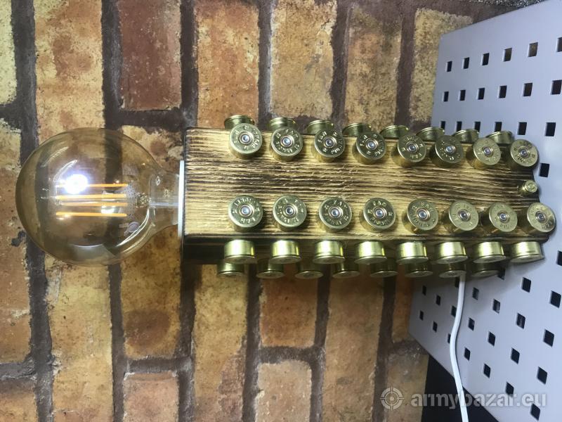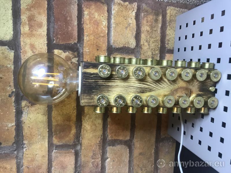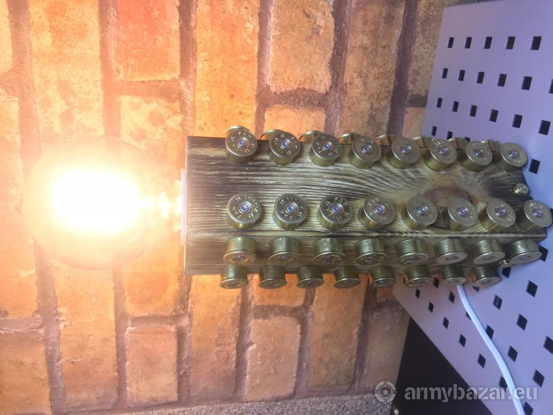 Opis: Sprzedam lampę, wykonana własnoręcznie z 64 łusek kalibru 12 oraz 4 łusek 9mm. Ręczna robota, niepowtarzalna. Drewno postarzane