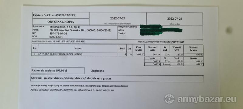 Opis: Sprzedam nową, nieużywaną latarkę Oligt Odin 2000 lumenów do montażu na szynie M-LOK. Posiada wyłącznik z adapterem do instalacji na szynie RIS/Picattiny. Kupiona 21.07.2022 w Militaria PL. Faktura na zdjęciu. Zapłaciłem 699 zł, sprzedam za 550 zł.