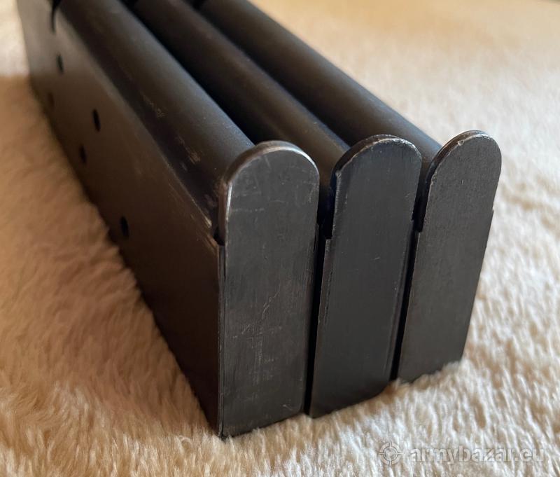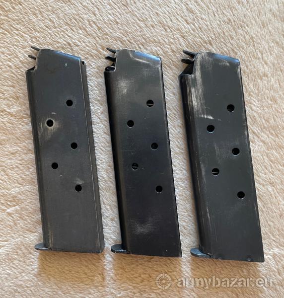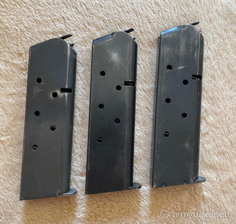 Opis: Magazynki do Colt 1911 .45 ACP i innych klonów. Bez oznaczeń, czyli produkcji Colta. Dedykowane do pistoletów z okresu IIWŚ, ale pasują do tych od początku produkcji do czasów współczesnych. Stany bardzo dobre, bez rdzy czy wżerów, jedynie otarcia powstałe w czasie użytkowania. Polecam. Kontakt na tel. 602 75 61 5trzy.