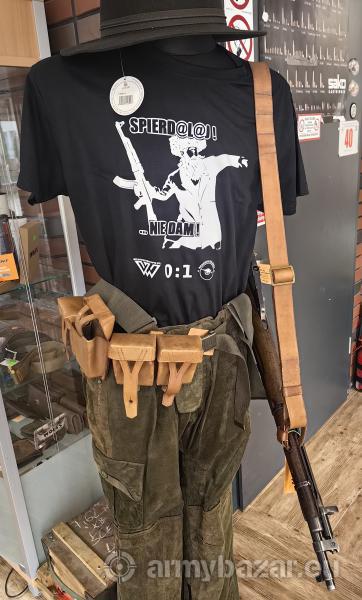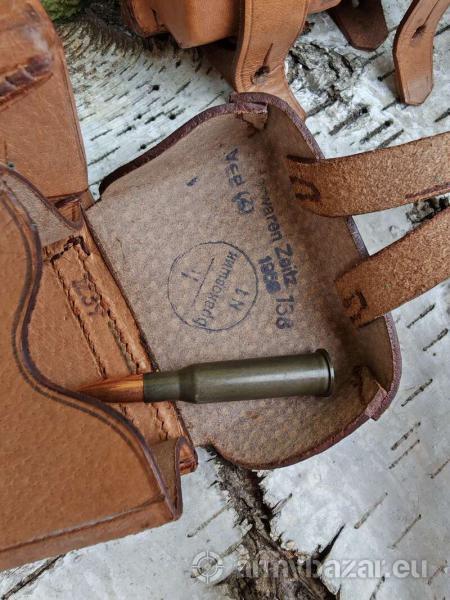 Opis: „Wyjątkowy zestaw z wyjątkową historią. Wojenne zapasy skóry na pasy do K98 dla Wehrmachtu. Armia sowiecka przejęła zapasy i fabrykę. DO roku 1950 w DDR produkowano pasy i ładownice do Mosina ze zdobycznej skóry po-niemieckiej. Jak widać na zdjęciach, na niektórych z nich są pieczątki odbioru wojskowego komisarza (cyrylicą). Leśny zdobył dosłownie kilka sztuk z magazynów w Odessie. Z TYCH magazynów, w których wciąż leży broń z II wojny światowej. Widzieliście w ogóle kiedyś SKÓRZANY pas nośny do Mosina? Kupujesz zestaw: pas + dwie ładownice”