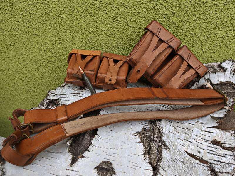 Opis: „Wyjątkowy zestaw z wyjątkową historią. Wojenne zapasy skóry na pasy do K98 dla Wehrmachtu. Armia sowiecka przejęła zapasy i fabrykę. DO roku 1950 w DDR produkowano pasy i ładownice do Mosina ze zdobycznej skóry po-niemieckiej. Jak widać na zdjęciach, na niektórych z nich są pieczątki odbioru wojskowego komisarza (cyrylicą). Leśny zdobył dosłownie kilka sztuk z magazynów w Odessie. Z TYCH magazynów, w których wciąż leży broń z II wojny światowej. Widzieliście w ogóle kiedyś SKÓRZANY pas nośny do Mosina? Kupujesz zestaw: pas + dwie ładownice” Link do strony sklepu poniżej. https://wunderwaffe.pl/pl/shop/mosinowy-pas-skorzany-z-2-adownicami~p132345