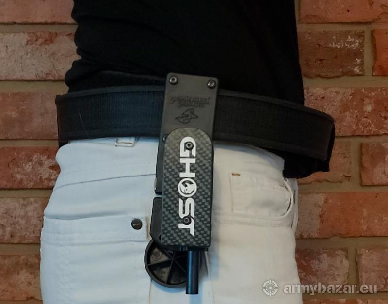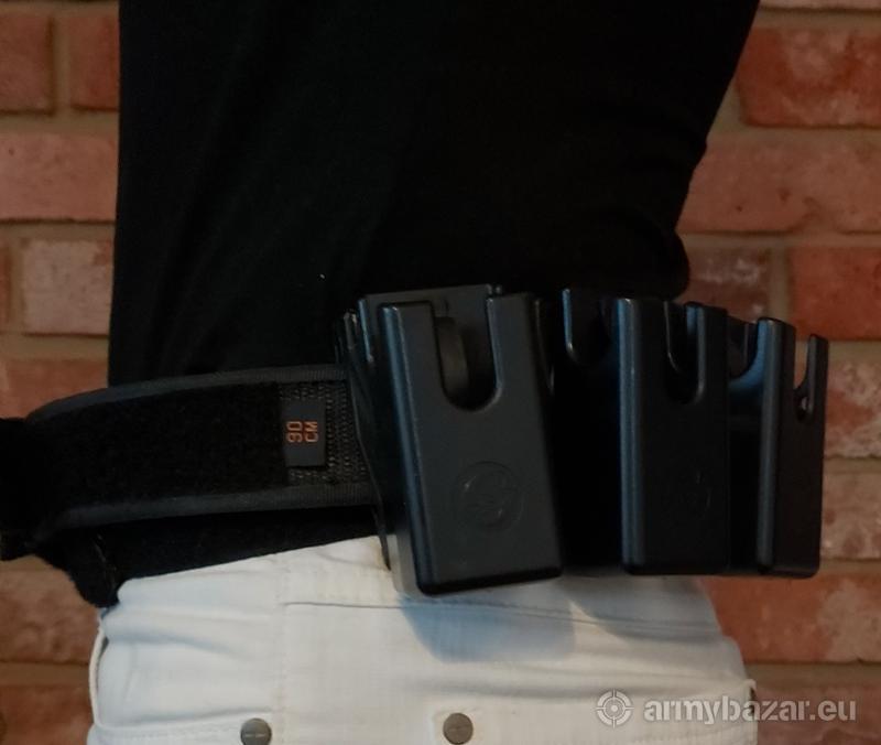 Opis: Praktycznie nowy kompletny pas z wieszakiem Ghost plus 3 ładownice 360° na magazynki dwurzędowe. 90cm.