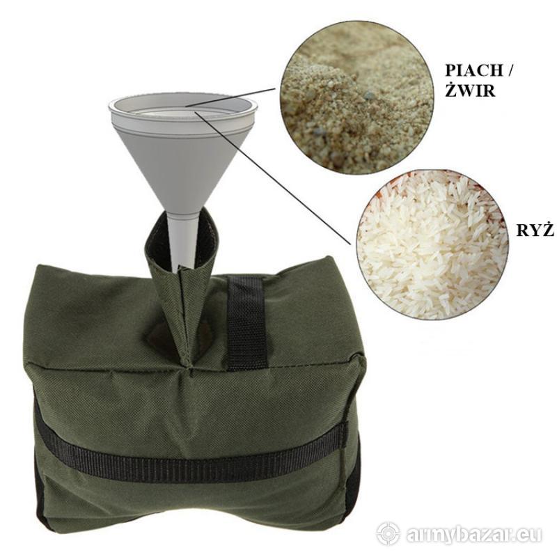 Opis: PODUSZKI, WORKI STRZELECKIE do przestrzeliwania broni, wiatrówek, itp. Idealnie nadają się na strzelnicę, na twardą i miękką powierzchnię. Wykonane są z WYTRZYMAŁEGO i odpornego na uszkodzenia nylonu 600D oraz materiału welurowego w kolorze czarnym. Na spodzie poduszek znajduje się zamykany otwór służący do wsypywania wypełnienia typu piasek. W skład kompletu wchodzi mała i duża poduszka. DANE TECHNICZNE: - wymiary: duża poduszka - 21,5 cm x 23 cm x 13,5 cm mała poduszka - 13 cm x 10 cm x 13 cm - waga: 200 g - wykonanie: NYLON 600D + welur