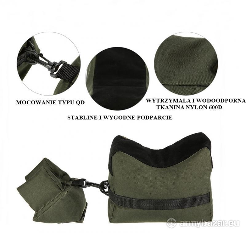 Opis: Mamy dzisiaj do zaoferowania PODUSZKI, WORKI STRZELECKIE do przestrzeliwania broni, wiatrówek, itp. Idealnie nadają się na strzelnicę, na twardą i miękką powierzchnię. Wykonane są z WYTRZYMAŁEGO i odpornego na uszkodzenia nylonu 600D oraz materiału welurowego w kolorze OLIV. Na spodzie poduszek znajduje się zamykany otwór służący do wsypywania wypełnienia typu piasek. W skład kompletu wchodzi mała i duża poduszka. DANE TECHNICZNE: - wymiary: duża poduszka - 21,5 cm x 23 cm x 13,5 cm mała poduszka - 13 cm x 10 cm x 13 cm - waga: 200 g - wykonanie: NYLON 600D + welur