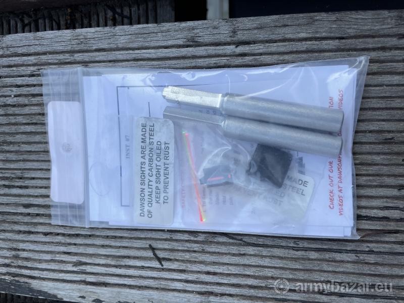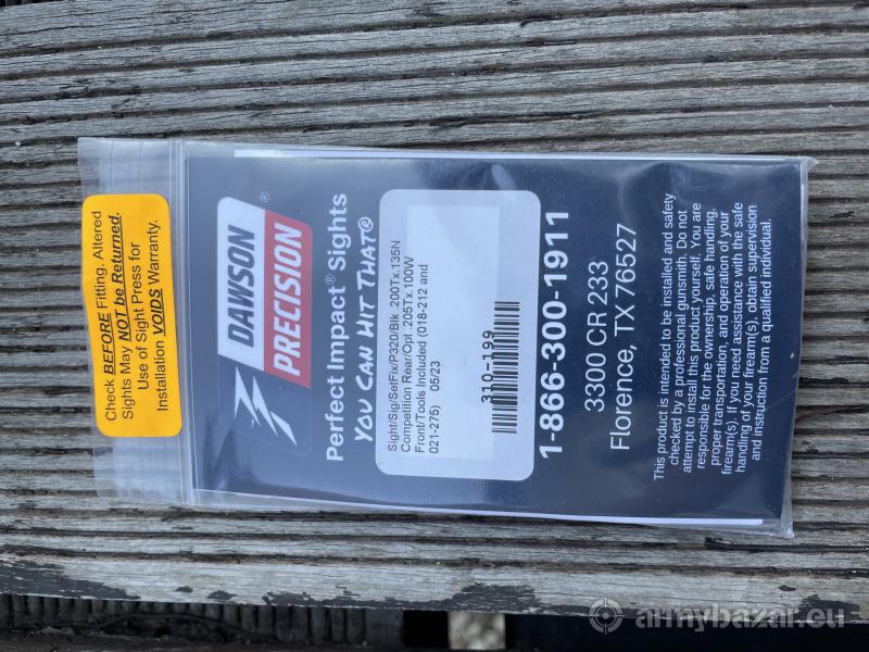 Opis: Stałe przyrządy celownicze Dawson Precision Competition Set do Sig Sauer P320. Nowe, nie montowane. W zestawie dwa dodatkowe światłowody i podbijaki.
