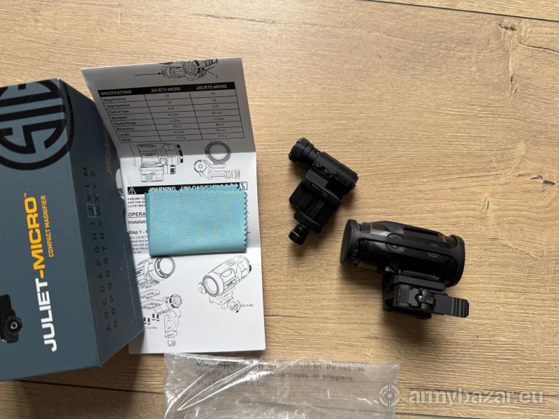 Opis: Sprzedam bardzo mało używany powiększalnik Sig Sauer Juliet5-Micro - SOJ5M001 oraz dodatkowy doskonały montaż Flip Away Mount również Sig Sauera o wartości 100 USD, znacznie lepszy niż należący do kompletu. Stockowy montaż nie był używany. Stan powiekszalnika bdb, szkła idealne. Jedynie okular w części pierścienia o powierzchni radełkowanej delikatnie przytarty o elementy oporządzenia. Zapraszam!