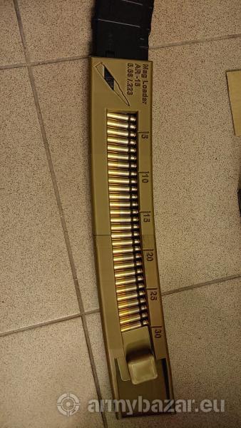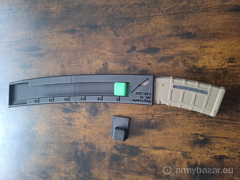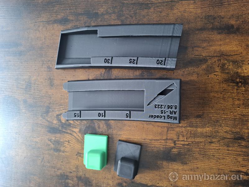 Opis: Witam Do sprzedania tak jak w tytule nowe szybkoładowarki do magazynków od AR-15, M4, GROT itp. Urządzenie jest wydrukiem 3D z czarnego PLA. W zestawie szybkoładowarka w dwóch częściach (na życzenie kupującego moge je scalić klejem dwuskładnikowym) oraz dwa dopychacze (jeden zapasowy zawsze w kolorze kontrastującym). Szybkoładowarka ładuje naraz 30 naboji.