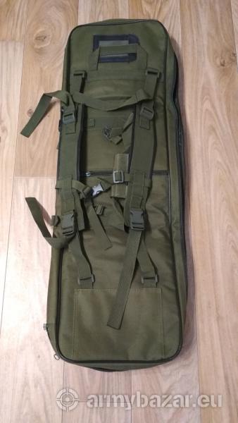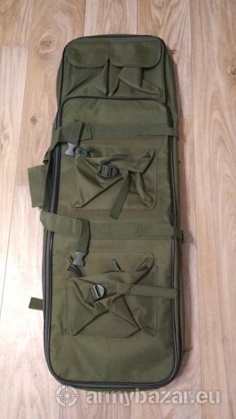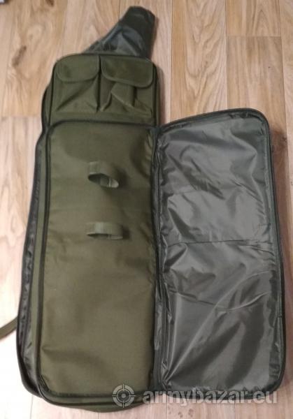 Opis: Nowa torba na broń, dwie kieszenie na broń cztery mniejsze. Dł 80 cm, dł z kominem 100 cm, szerokość 28cm.