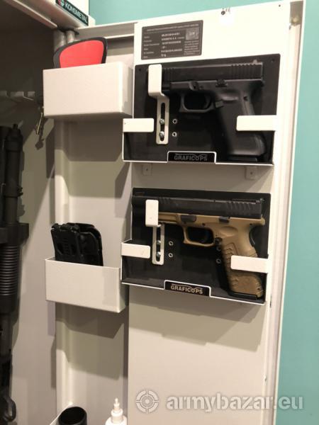 Opis: Uchwyt magnetyczny - idealne rozwiązanie do lepszego zagospodarowania miejsca w szafie na broń oraz wyeksponowania twojej kolekcji broni krótkich. Doskonale nadaje się do montażu na wewnętrznej powierzchni drzwi lub bocznej ściany szafy pancernej. Uchwyt wykonany jest z balchy aluminiowej malowanej proszkowo. Pasuje do większości pistoletów. Mocowanie uchwytu magnetyczne do ściany np. sejfu, czy szafy, wewnętrznej strony drzwi i innych powierzchni metalowych. Wymiary: 23x15,5x4cm. Uchwyt malowany proszkowo na czarny kolor, oraz oklejony jest pianką (czarna, czerwona, zielona, niebieska lub pomarańcz). Koszt wysyłki 18zł kurier lub pobranie 20zł. tel.509 353 052