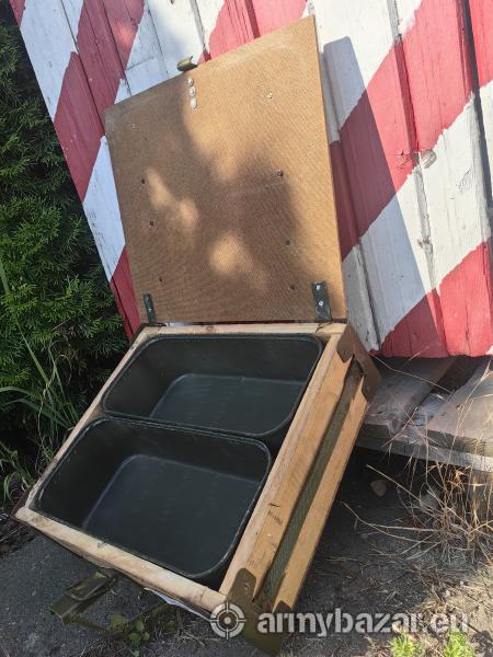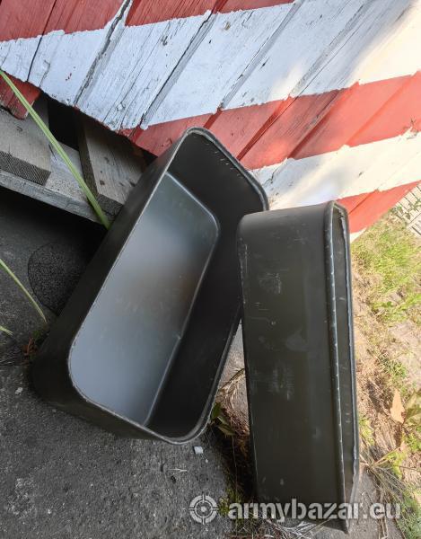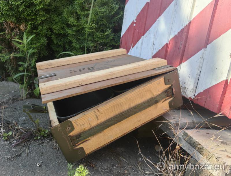 Opis: Dwie wojskowe skrzynki metalowe transportowe w drewnianej skrzyni.Każda drewniana skrzynia posiada wygodny uchwyt do przenoszenia. Wymiar zewnętrzny skrzyni 40cm x 36 cm.Wys.13cm. Napisy na skrzyniach losowe. Płatność gotówką.Link do strony sklepu poniżęj. https://wunderwaffe.pl/pl/shop/wojskowe-skrzynki-transportowe-w-drewnianej-skrzyni~p143883