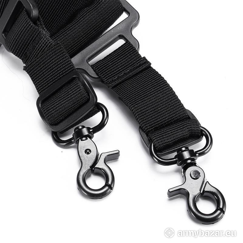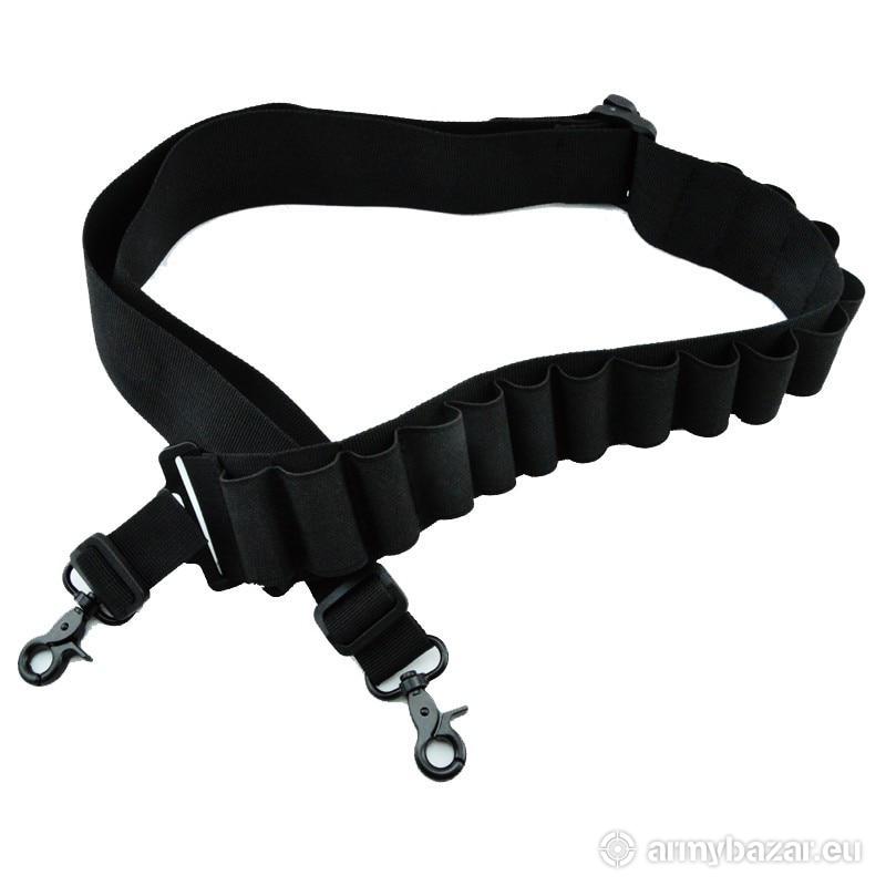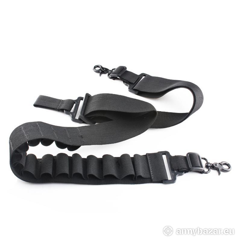 Opis: Dwupunktowe zawieszenie taktyczne z uchwytem na naboje kal. 12 / 20 gauge w kolorze CZARNYM. Pas posiada miejsce do przenoszenia 15 sztuk naboi do broni śrutowej. Pasy wykonane z wytrzymałego i odpornego NYLONU 800 D oraz stali.Stalowe obrotowe uchwyty oraz solidny pas pozwalają na bezproblemowe i komfortowe przenoszenie broni oraz amunicji.Zawieszenie posiada regulację długości w zakresie od 104 cm do 140 cm, dzięki czemu można go używać nawet z pełnym wyposażeniem. DANE FABRYCZNE:Materiał: nylon 800 D Możliwość przenoszenia amunicji: TAK - 15 sztuk Uchwyty: stalowe obrotowe. Długość pasa: 104 – 140 cm Szerokość pasa: 5 cm Waga: 140 g.