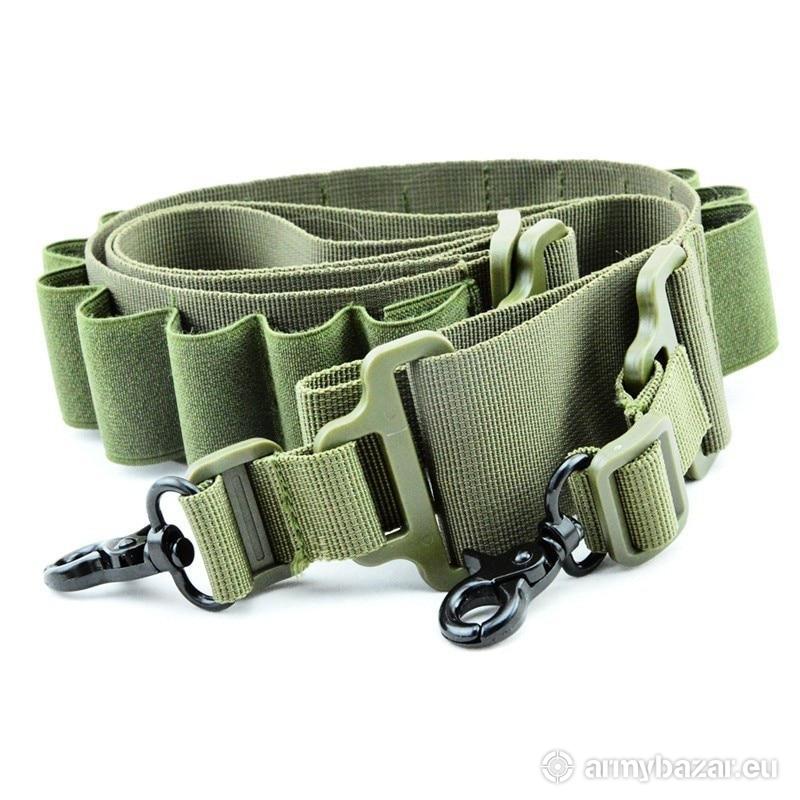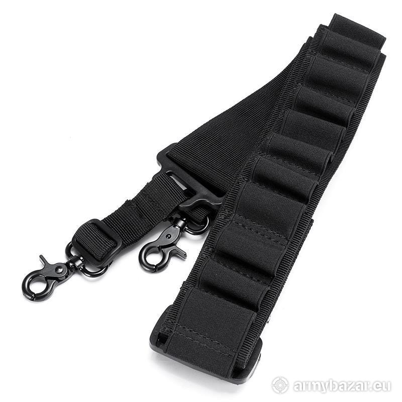 Opis: Dwupunktowe zawieszenie taktyczne z uchwytem na naboje kal. 12 / 20 gauge w kolorze CZARNYM. Pas posiada miejsce do przenoszenia 15 sztuk naboi do broni śrutowej. Pasy wykonane z wytrzymałego i odpornego NYLONU 800 D oraz stali.Stalowe obrotowe uchwyty oraz solidny pas pozwalają na bezproblemowe i komfortowe przenoszenie broni oraz amunicji.Zawieszenie posiada regulację długości w zakresie od 104 cm do 140 cm, dzięki czemu można go używać nawet z pełnym wyposażeniem. DANE FABRYCZNE:Materiał: nylon 800 D Możliwość przenoszenia amunicji: TAK - 15 sztuk Uchwyty: stalowe obrotowe. Długość pasa: 104 – 140 cm Szerokość pasa: 5 cm Waga: 140 g.